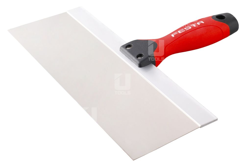 - Špachtľa nehrdzavejúca 250mm s výstužou je vyrobená z vysoko kvalitnej a pružnej nehrdzavejúcej ocele, rukoväť je ergonomicky tvarovaná, gumový povrch.