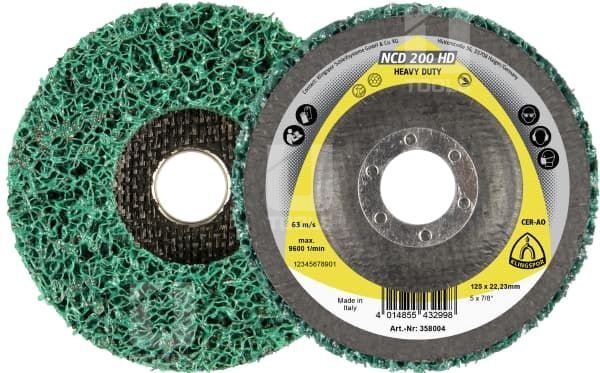 Čistiaci kotúč NCD200HD je ideálnym doplnkom uhlovej brúsky pre odstraňovanie tepelného zafarbenia a čistenie povrchov. Skladá sa zo špeciálnej netkanej čistiacej siete SiC, ktorá sa vďaka svojej otvorenej štruktúre nezanáša. Spoločnosť Klingspor používa na lepenie syntetickú živicu, pretože tento materiál podporuje pozitívne vlastnosti zrna SiC. Čistiaci kotúč NCD200HD je vynikajúcou voľbou pre prácu na povrchoch