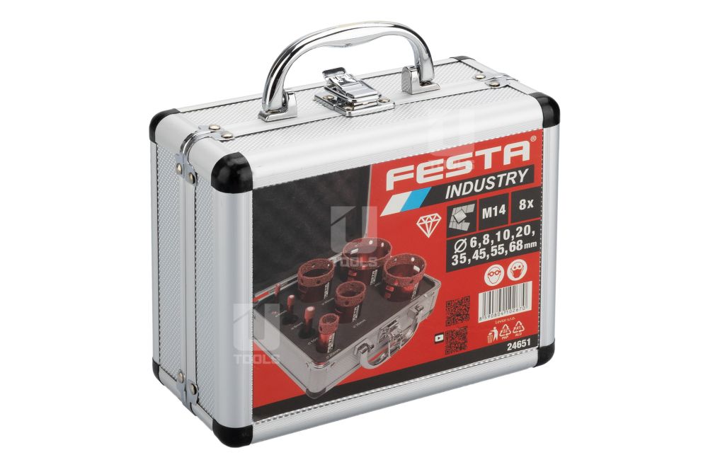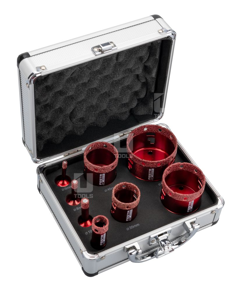 Súprava obsahuje profesionálne vykružovacie diamantové korunky s priemermi 6, 8, 10, 20, 35, 45, 55 a 68 mm. Tieto rozmery zodpovedajú najčastejšie používaným otvorom pre uchytenie sprchových kútov, vodovodné priechodky, odpadové rúry alebo elektroinštalačné krabice.