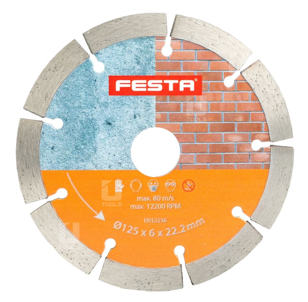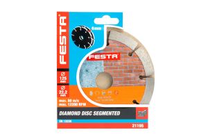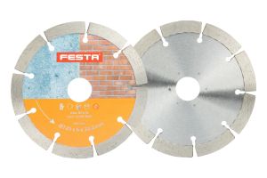 - Dvojitý diamantový segmentový kotúč FESTA na drážkovanie, 125 x 6 mm, priemer otvoru 22,2 mm, výhodou kotúča je, že ho možno upnúť aj do bežnej uhlovej brúsky!