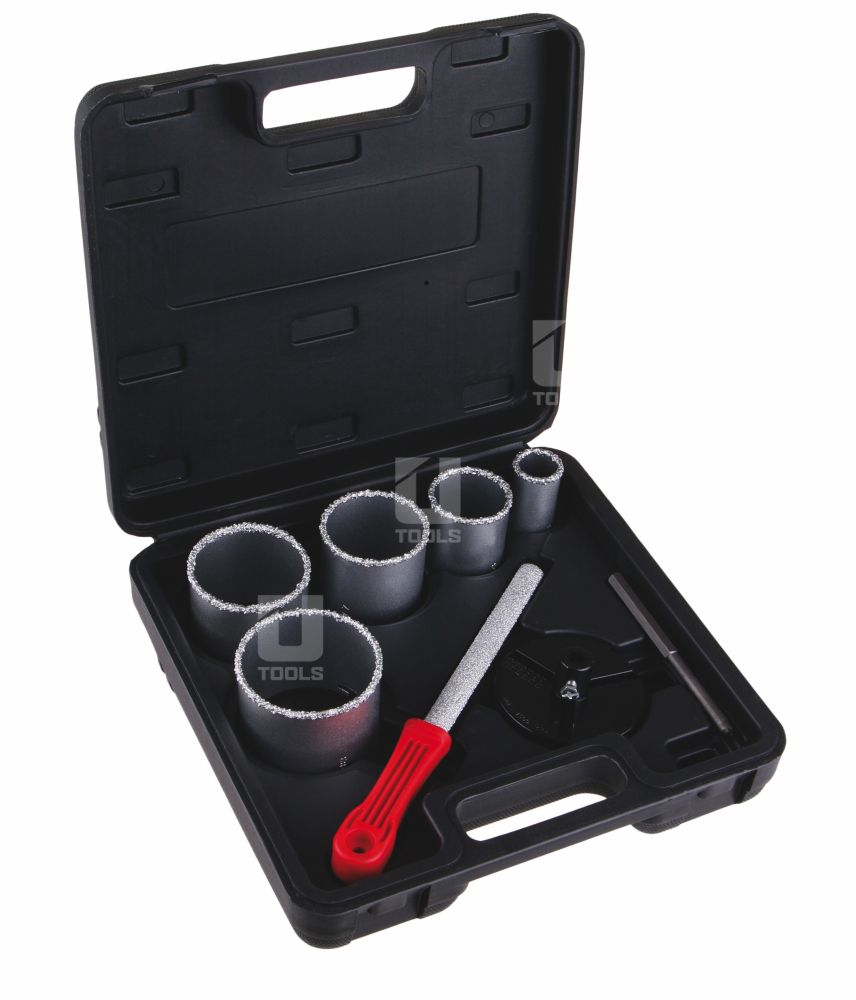 - súprava vykružovacích koruniek s karbidovým ostrím na čisté a presné vŕtanie keramickej dlažby a obkladov s pilníkom