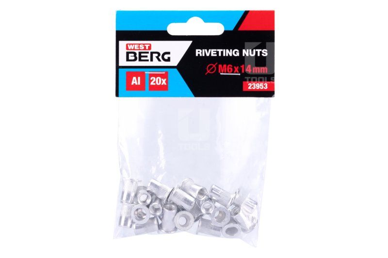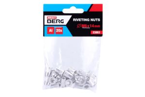- Hliníková nýtovacia matica s metrickým závitom M6, dĺžka 14 mm, počet v balení 20 ks, zúbkovaný golier pre väčšiu pevnosť spoja.