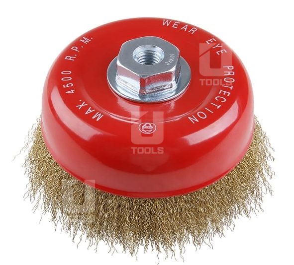- Rotačná kefa hrncová, vlnitá, pomosadzená, M14, 150 mm