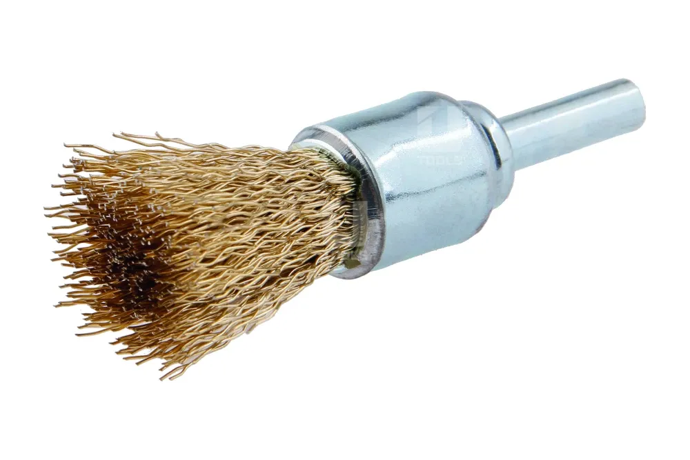 - Rotačná kefa koncová, vlnitá, pomosadzená, stopka, 17 mm