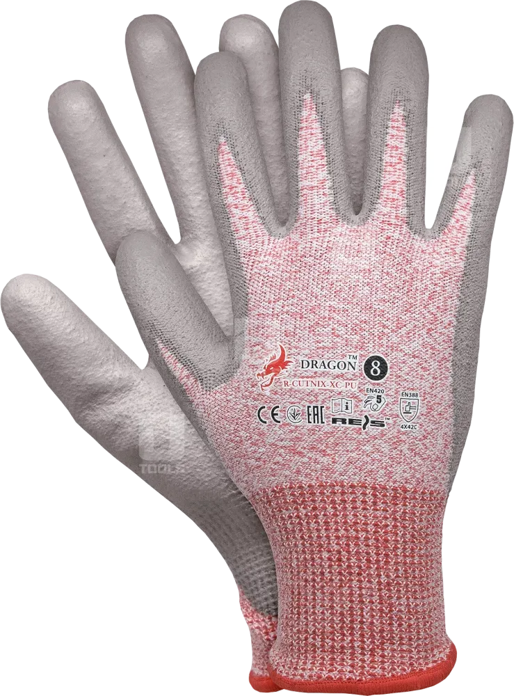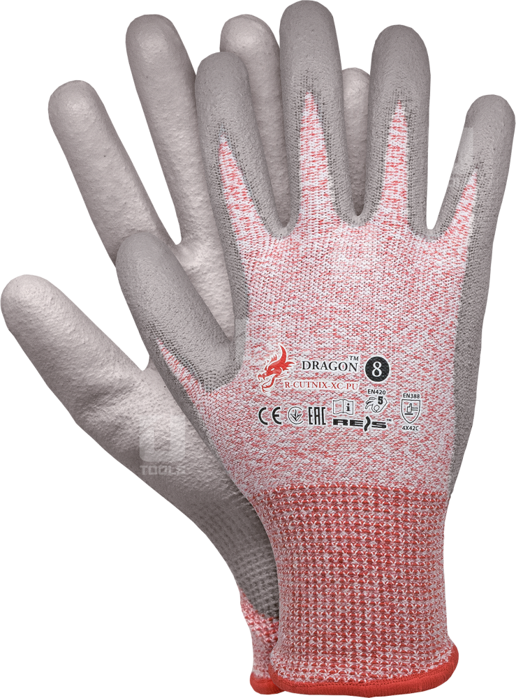 Vyrobené z kombinácie UHMWPE (polyetylén s ultra vysokou molekulovou hmotnosťou) a skleného vlákna, dlaň je povrstvená polyuretánom. Rukavice sú zakončené sťahovacím lemom a poskytujú vysokú odolnosť proti prerezaniu, oderu a roztrhnutiu.