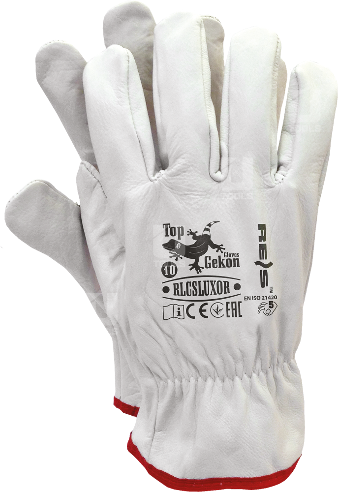 Vyrobené z hovädzej lícovej kože v bielej farbe, ktorá poskytuje vysokú pevnosť, odolnosť a pohodlie pri nosení. Rukavice sú celokožené – teda vyrobené úplne z kože vrátane manžety, čo zaisťuje rovnomernú ochranu celej ruky. Dlaň je v celodlaňovom prevedení, teda z jedného kusu kože bez švov, čo výrazne zvyšuje odolnosť proti oderu a predlžuje životnosť. Stiahnuté zápästie zabezpečuje pevné priliehanie a bráni prenikaniu prachu či vetra.