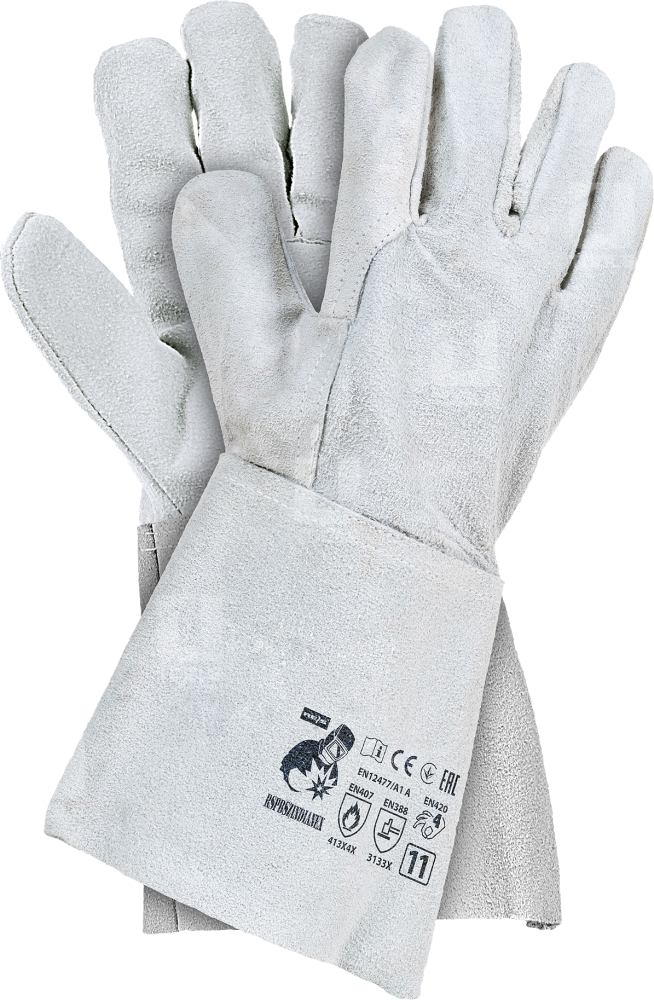 Vyrobené z hovädzej štiepanej kože, ktorá je pevná, odolná a vhodná pre prácu s iskrami či teplom. Dlaň je z jedného kusu kože, čo zvyšuje ich životnosť a odolnosť proti oderu. Rukavice sú celokožené vrátane dlhej manžety, ktorá siaha do polovice predlaktia a chráni zápästie pred poranením a vlhkosťou. Odolávajú kontaktnému teplu do 100 °C a spĺňajú triedu ochrany Typ A.