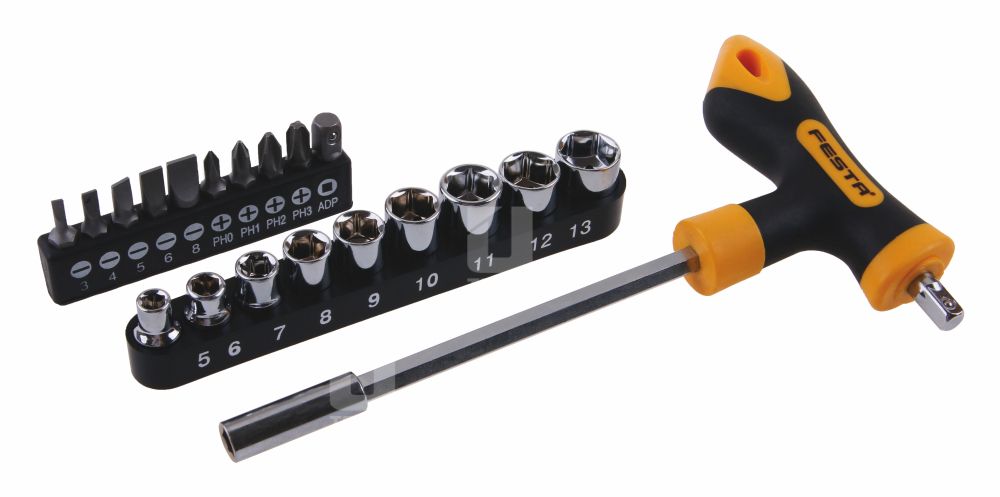 - obsah sady: bity ploché 3, 4, 5, 6, 8 a PH 0, 1, 2, 3 a adaptér šesťhran 1/4" - štvorhran 1/4" hlavice 5, 6, 7, 8, 9, 10, 11, 12, 13