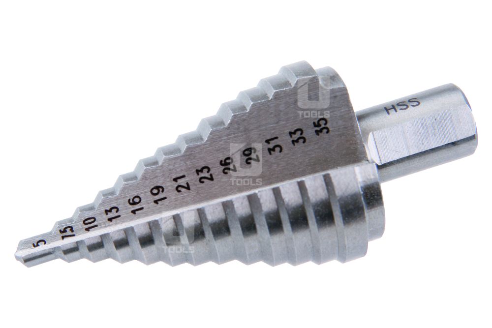 - stupňovitý vrták z kvalitnej HSS ocele DIN 1412C na vŕtanie zliatin a oceľových platní do hrúbky 4 mm, plastu a dreva