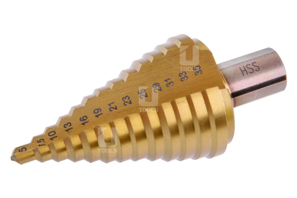 - stupňovitý vrták z kvalitnej HSS ocele DIN 1412C s TiN vrstvou