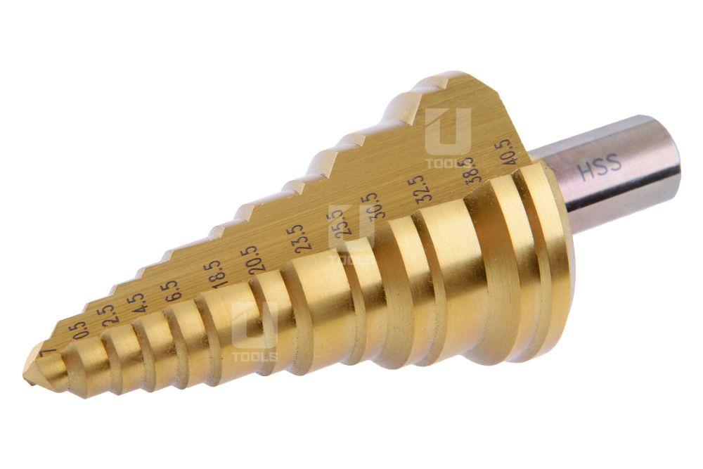 - stupňovitý vrták z kvalitnej HSS ocele DIN 1412C s TiN vrstvou
