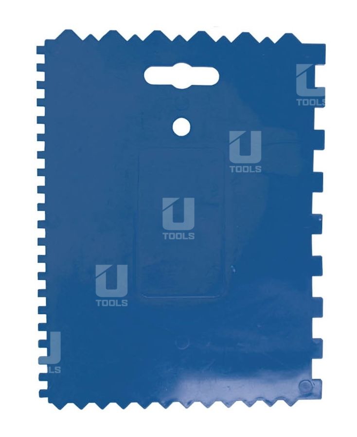Univerzálna zubová stierka na efektívne nanášanie lepidiel, tmelov a stavebných hmôt na menších plochách. Vyrobená z odolného plastu, vďaka čomu je ľahká, pevná a pružná. Rôzne typy a veľkosti zubov po okrajoch jednej stierky umožňujú použitie na rôzne druhy obkladov a dlažieb.