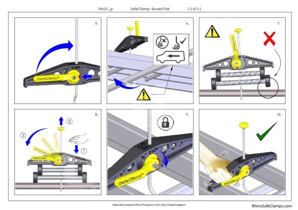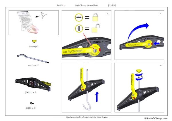 Rhino SafeClamp predstavuje pokrok oproti tradičným skrutkovacím sponkám na rebríky. Vyrobený z nehrdzavejúcej ocele a kompozitných materiálov aby zabezpečil pevnosť, odolnosť proti korózii a dlhú životnosť. Patentovaný uzamykací mechanizmus ramena umožňuje, že SafeClamp sa upevní 5x rýchlejšie než skrutkovacia spona na rebrík. Obsahuje integrovaný uzamykací mechanizmus, takže už nepotrebujete visiace zámky.